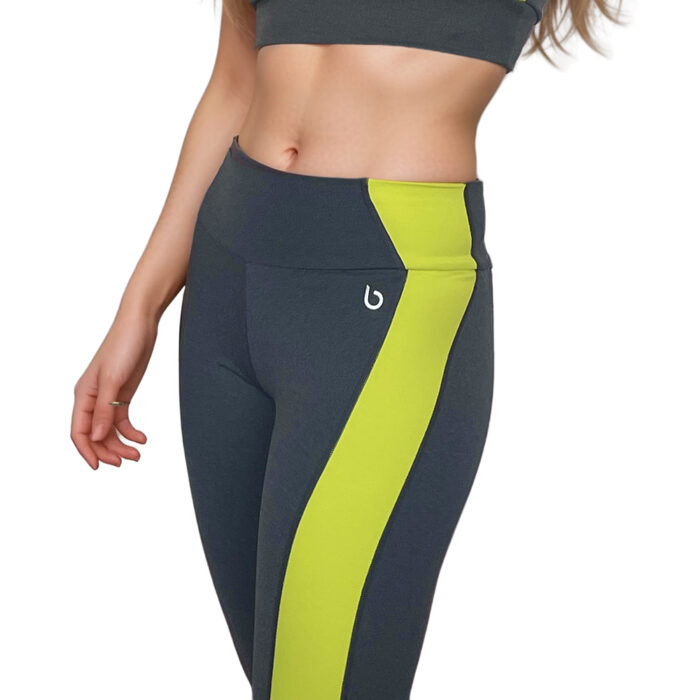 A legging encorpada de alta compressão possui listras laterais amarelas, que alongam a silhueta. Ela garante cobertura total e firmeza durante o exercício. Possui tecnologia de proteção UV 50+ e anti pilling (não dá borboto!).